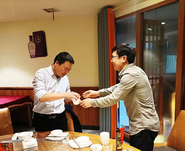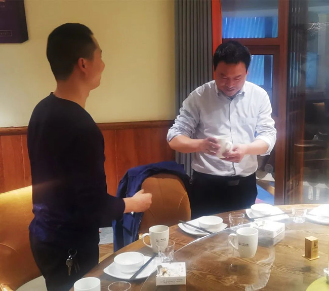 在宴會(huì)上,劉洋、丁永繼兩位徒弟向師傅劉美林總經(jīng)理行拜師禮——首先向師傅深深鞠躬:表示在今后的工作中一定誠(chéng)心、細(xì)心、虛心地向師傅學(xué)習(xí)請(qǐng)教。盡己所能處理和解決工作中的常規(guī)問題,遇事多征求師傅意見;同時(shí)會(huì)多看些企業(yè)管理方面的書籍,也希望在座的各位干部多多指教。接著,兩位向師傅敬茶。